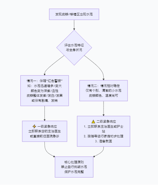 这是一个需要高度重视的信号。移植区域或皮瓣上出现水泡,通常是 “静脉回流受阻”或“局部张力过高” 的典型表现,可能预示着血运危象,必须立即、正确处理。