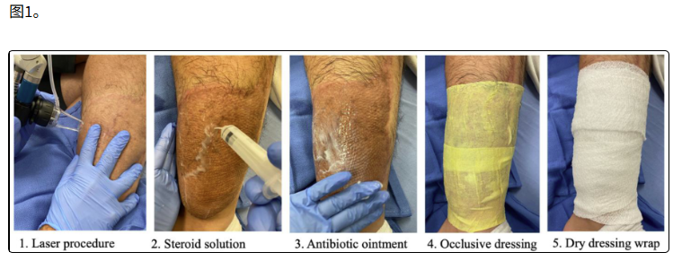 关于激光治疗,两地均使用消融分段Lumenis UltraPulse CO2激光器(以色列约克内姆)。所有疤痕的第一次扫描设置在DEEP效果器上,密度5%,600赫兹,能量35毫焦耳。然后调节能量能级,使点状出血降至最大50 mJ。第二次通过时,SCAAR FX设定为1%密度、120 mJ、300 Hz,用于对厚度超过2mm的疤痕进行更深的穿透。手术后,立即涂抹400毫克/10毫升的曲安奈德溶液。激光治疗区域覆盖2%莫匹罗星软膏和封闭性凡士林纱布(见图1)。患者被指示将敷料敷料敷在身上,最多24小时后可以取下敷料并淋浴。