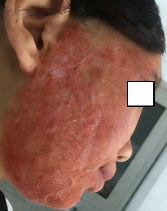 右半边脸是暗红色的移植皮肤,边缘隆起如山脉;右眼因为瘢痕牵拉,眼裂变小;原本浓密的右侧眉毛消失不见;耳廓部分变形,像融化的蜡烛。