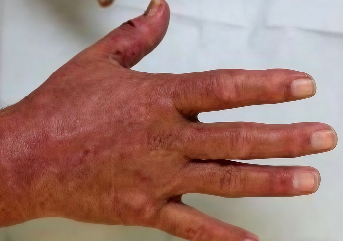 2023年11月的一个周末,张医生在家煮面时,一整锅沸水意外倾覆。滚烫的开水浇透了他的右手瞬间红肿起泡。