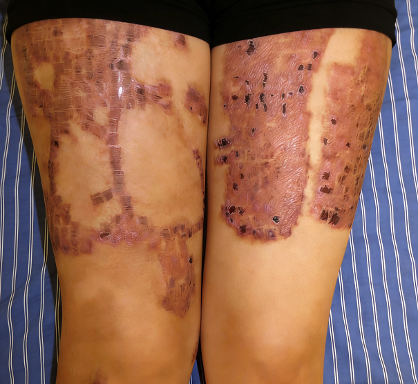 两周后:原烫伤区域出现网格状色素沉着和点状凹陷